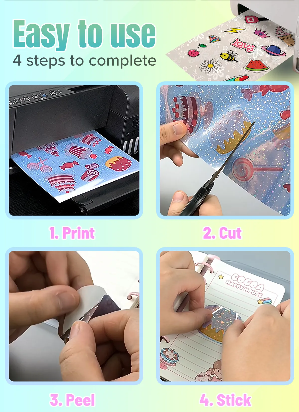 Holographic Effect Design: The printable sticker paper is featuring rainbow color and smooth surface, the color can be changed according to light and angle. Different from pure white paper, your creative ideas can be perfectly applied in beautiful colors and vivid designs.